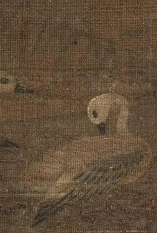 郊外田野、流淌的小河、参差的河岸、群栖的小鸟等,描绘此类浅显景色的画被称为“小景画”。传统上将中国五代时期的画家惠崇尊为小景画的始祖,此类画为北宋时代末宗室画家们所好,其后的画家们也对这种特殊的画态颇感兴趣。小景画的遗作不多,年代久远的作品更加稀少,而本图就是其中难得的遗作之一。图下方绘有大雁群栖在败芦枯蓼的汀洲中,是小景画中常见的情景。右方的土坡为细竹林,其中有枯木如倒卧一般伸出一枝树干。枯木梢上停着一只小鸟,令人印象深刻。枯木上还夹着两枝斜向伸出的竹子,其中一枝下垂,竹枝张开将视线遮住。竹子以细墨线勾出,淡绿色赋彩。芦苇以淡墨色勾出,淡褐色赋彩。枯木以抑扬笔线勾出,加淡墨的小笔触绘成。与此类竹与树木的描绘手法相比,大雁并无轮廓,即采用“没骨”技法,展示了主题与画法的传统,意味深长。水面和余白以淡蓝色渲淡,用来充实空间表现。