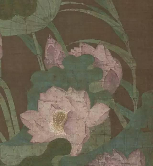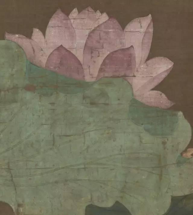 在中国江南的毘陵(常州)等地,自五代以后,着色画,水墨画中均频频出现莲池水禽图。本图带有五代南唐顾德的款印,但属南宋末期着色画的代表性作品。画作中可见莲花自蓓蕾到开花再到落花的时间的推移。三井家旧藏品。
