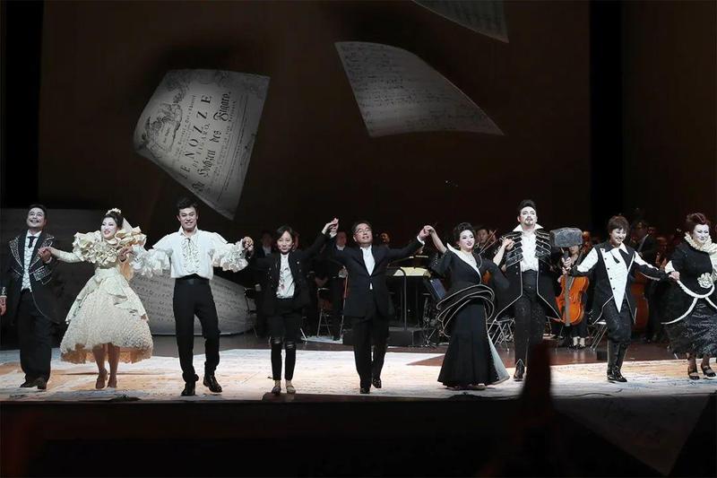 中央歌剧院版本《费加罗的婚礼》的与众不同之处在于,导演创造性地加入了莫扎特这个角色来贯穿全剧。墨水瓶、钢笔、揉皱的纸团和几张《费加罗的婚礼》手稿,构成了整个舞台布景——莫扎特的办公桌。演员们的黑白造型仿佛一个个音符,他们在莫扎特的点化下慢慢化为剧中人物跃然纸上。