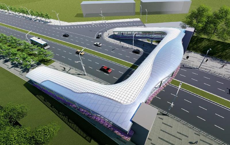 位于观兴东路与人民路路口西侧,单梯道天桥,服务周边产业园区和风景区,两侧分别设置垂直电梯。