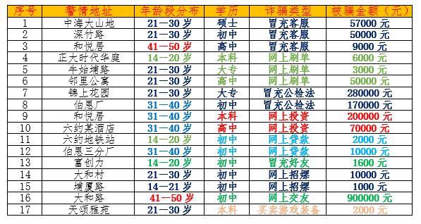 2021年7月31日至8月6日六约派出所共发诈骗警情17宗,合计被骗金额1821600元人民币。其中,冒充客服3宗、网上刷单3宗、网上投资2宗、冒充公检法2宗、网上贷款2宗、网上招嫖2宗、冒充他人1宗、买卖游戏装备1宗、网上交友1宗,女事主9名、男事主8名。
