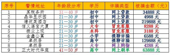 2021年7月17日至7月23日六约派出所共发诈骗警情9宗,合计被骗金额475892元人民币。其中,网上贷款3宗、冒充客服2宗、裸聊诈骗(敲诈)2宗、网上购物1宗、网上刷单1宗,女事主5名、男事主4名。