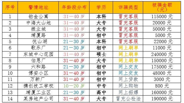 2021年7月10日至7月16日六约派出所共发诈骗警情14宗,合计被骗金额1189800元人民币。其中,冒充客服5宗、网上刷单3宗、网上交友2宗、网上贷款1宗、网上购物1宗、网上招嫖1宗、冒充公检法1宗,女事主11名、男事主3名。