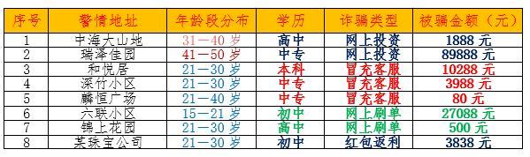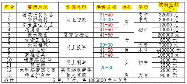2021年7月3日至7月9日六约派出所共发诈骗警情13宗,合计被骗金额4886800.83元人民币。其中,网上贷款4宗、网上投资4宗、网上刷单2宗、冒充客服1宗、买卖游戏装备1宗、冒充公检法1宗,女事主7名、男事主6名。