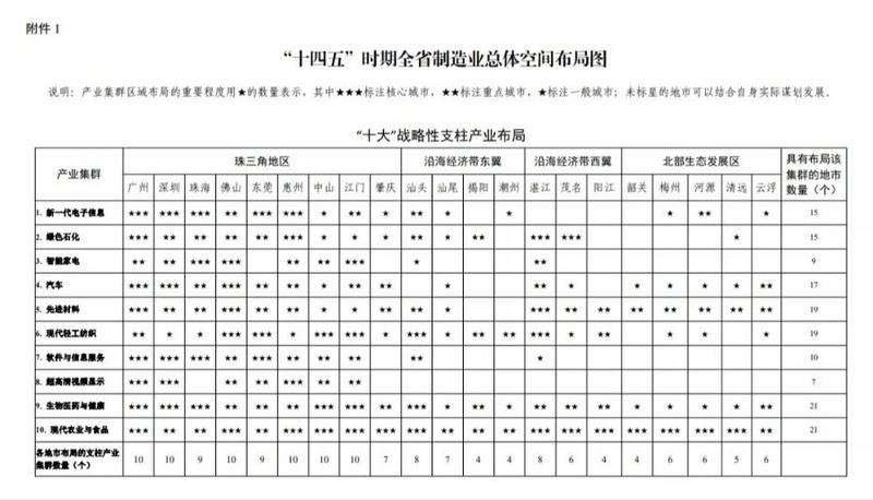 日前,《广东省制造业高质量发展“十四五”规划》(下称《规划》)印发,首次对全省21个城市培育发展20个战略性产业集群的区域布局重要程度进行了星级标注,三星标注为核心城市,二星标注为重点城市,一星标注为一般城市。