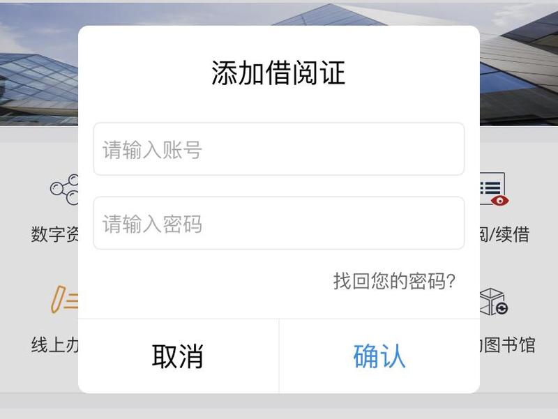 第❸步:进入微服务大厅,点击借阅证下方区域,输入读者证账号及密码,点击“确认”即可完成绑定。