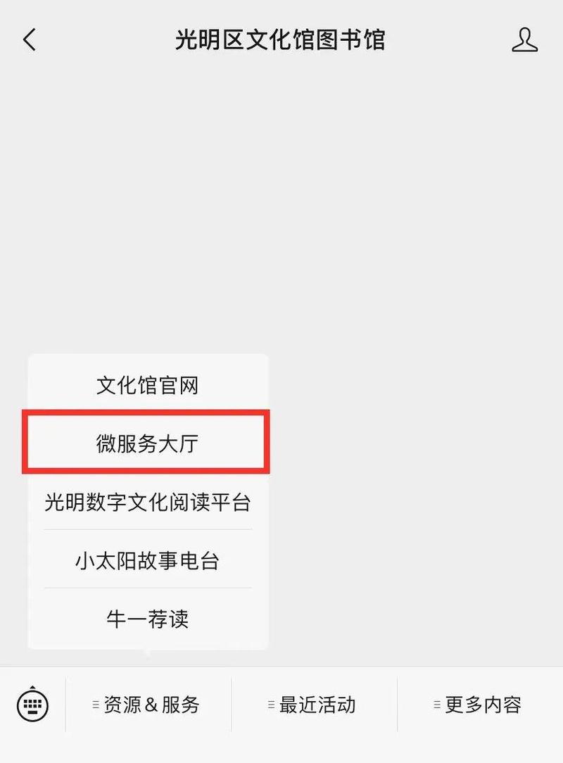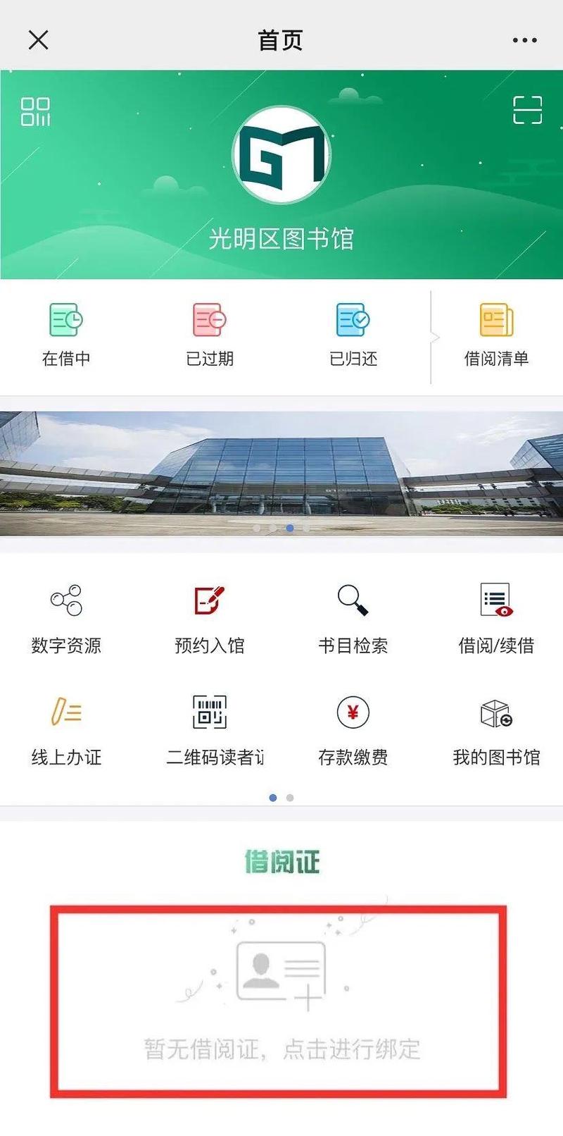在微信公众号『光明区文化馆图书馆』“微服务大厅”绑定读者证后,读者可自行查询借阅清单和阅读积分,在线完成书目检索、续借、存款缴费、预借等操作,使用二维码读者证、数字资源等服务。一个手机可同时绑定多个读者证。