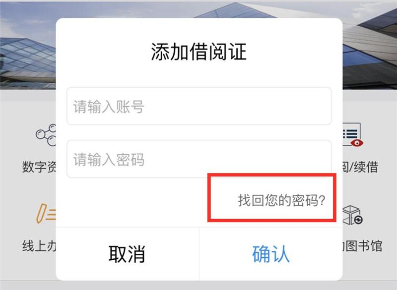 添加借阅证时点击“找回您的密码”,回答“密码提示问题”,输入姓名和身份证号,设置新的登录强密码,点击提交。