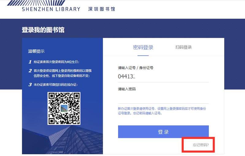 使用电脑浏览器打开“我的图书馆”:https://www.szlib.org.cn/auth/userLogin,输入读者证号,点击“忘记密码”,根据页面提示重置密码。(同上)