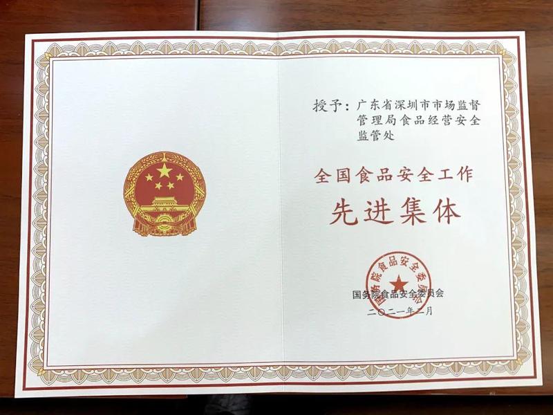 深圳连续五年在广东省食品安全工作评议考核中达到A级。2020年,深圳群众食品安全满意度80.9分,比2016年创建初期69.69分提高了11.21分,对创建工作的支持率达98.3%。2020年6月17日,经广东省食安委综合评估,深圳正式被命名首个“广东省食品安全示范城市”。2020年7月,中央广播电视总台《中国经济生活大调查》发布2019-2020年度“中国十大美好生活城市”榜单,深圳在食品安全满意度方面排名全国第一。2021年,深圳市市场监管局食品经营处被国务院食品安全委员会授予“全国食品安全工作先进集体”荣誉称号。