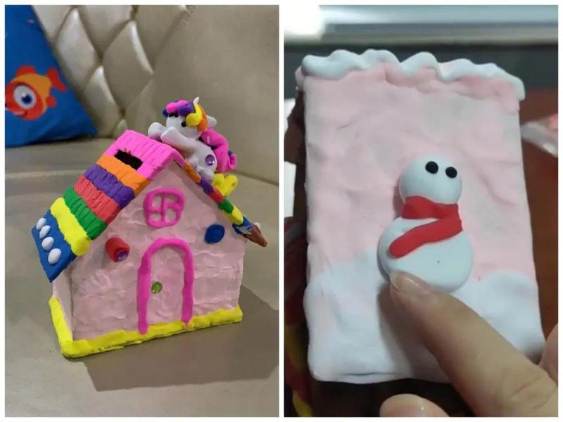 在老师的指导下,小朋友们把木质的零件抠出来,按照顺序拼好,然后利用橡皮泥进行装饰~