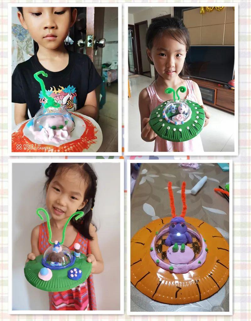 带着对神秘且浩瀚宇宙的憧憬,每个小读者都希望能有机会探索宇宙并与外星人接触交流。于是弯弯老师带着小读者们亲手制作乘着飞船的外星人。将塑料盖扣在纸盘上,画出圆盘,这就是外星人的座舱。将各色的黏土组合成不同形状,小读者们充分发挥想象力,捏造着各自心中外星人的模样。最后把盖子扣上,外星人就可以坐着飞盘起飞啦!