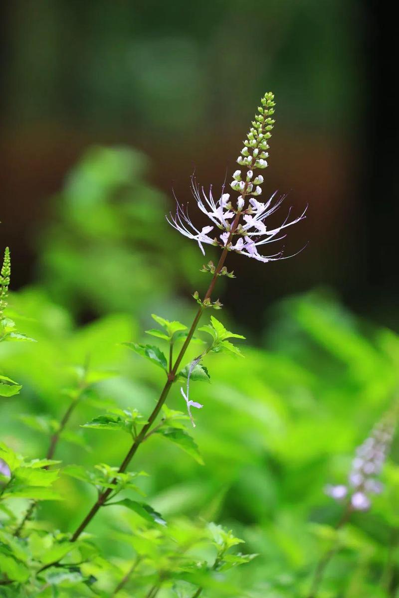 猫须草长出似猫的胡须,风吹过,花丝微微抖动,犹如一只调皮的小猫从草丛中探出脑袋。