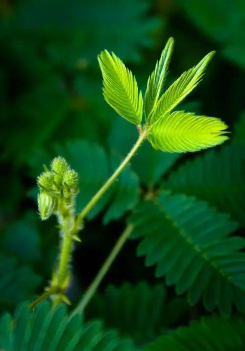 含羞草是深圳公园中比较常见的植物,它与一般安静的植物不同的是,当它受到触动时,羽状复叶会立即闭合起来,整个叶柄下垂,表现出一种“害羞”的样子。