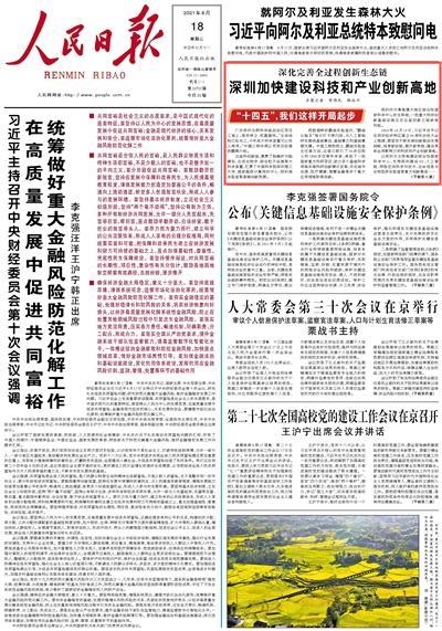 3、人民日报cue了光明,关注深圳加快建设科技和产业创新高地!在深圳建设中国特色社会主义,先行示范区两周年之际,《人民日报》头版关注深圳加快建设科技和产业创新高地,文章以光明科学城为重点案例点赞深圳科技创新工作。详情>>