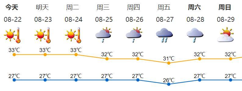 晴天间多云,天气炎热,局部有短时(雷)阵雨;中北部及人口密集区34-36℃;西南风2-3级;相对湿度55%-95%。