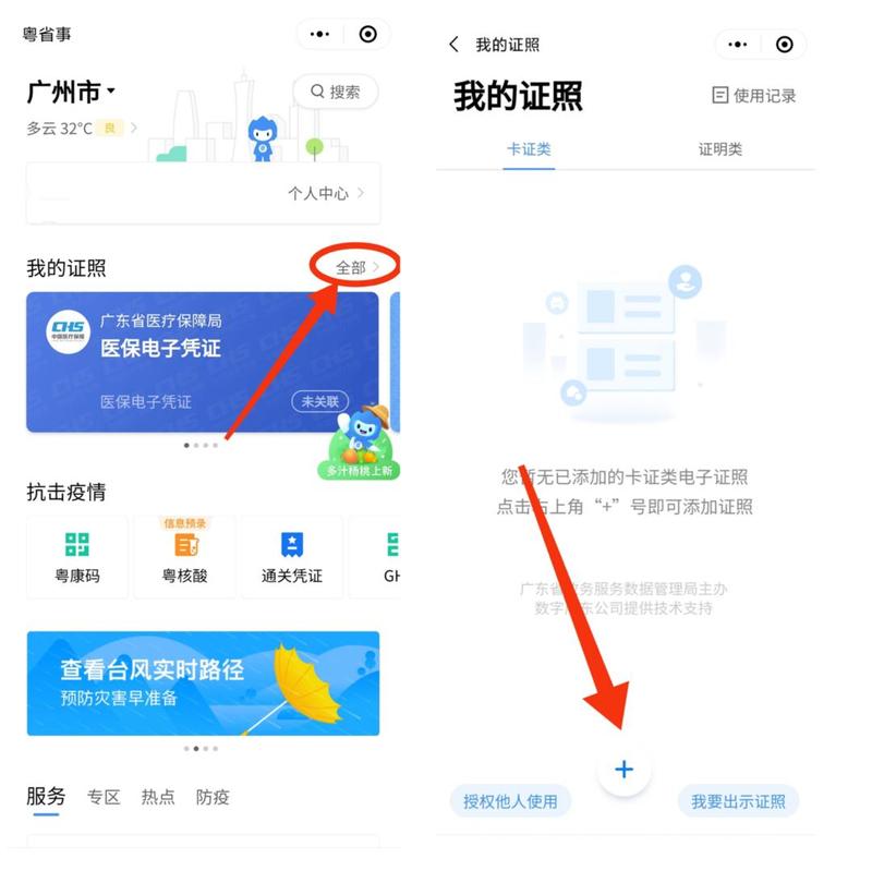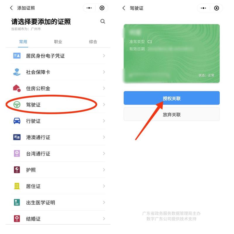 在“广东发布”微信公众号的菜单栏里点击“粤省事”进入小程序——登录后在“我的证照”中选择“全部”——点击“+”号——选择“驾驶证”——点击“授权关联”。