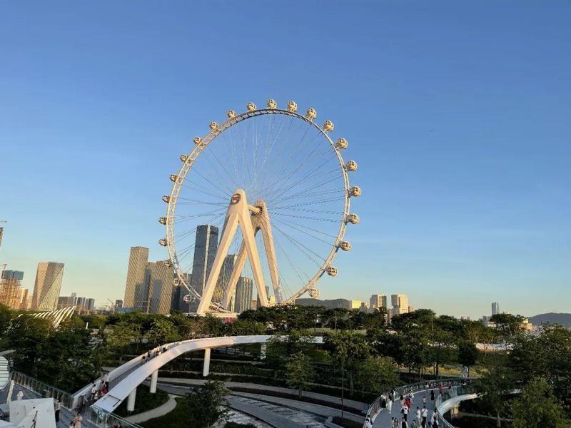 据介绍,“湾区之光”摩天轮高128米,位于宝安中心区与前海湾交汇处,是全国首座全天景轿厢摩天轮,共28个轿厢,身处其中可俯瞰大湾区的发展变化。今年4月正式投入运营后,迅速成为热门“打卡地”,日均接待旅客过万人次。