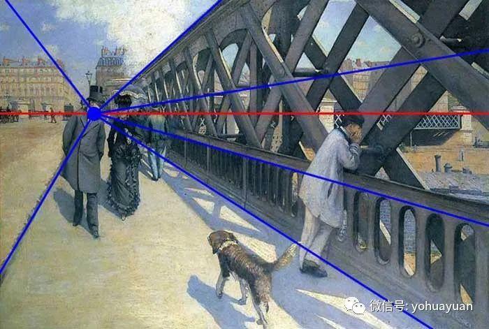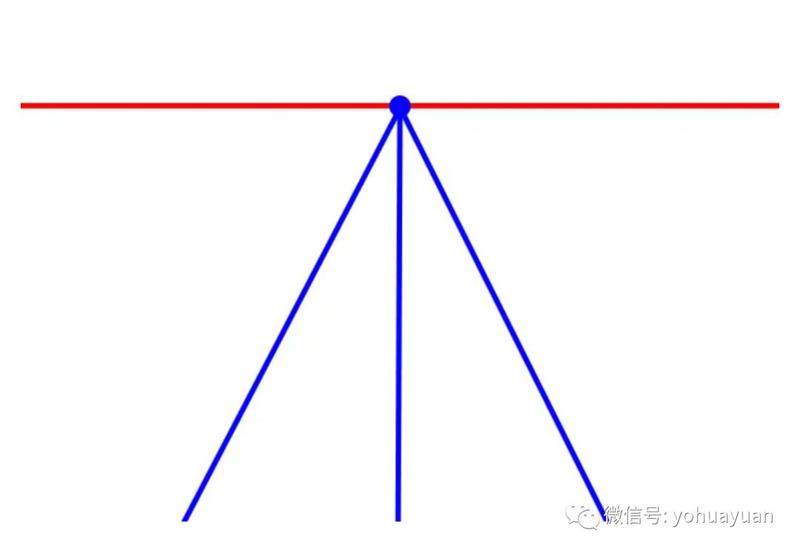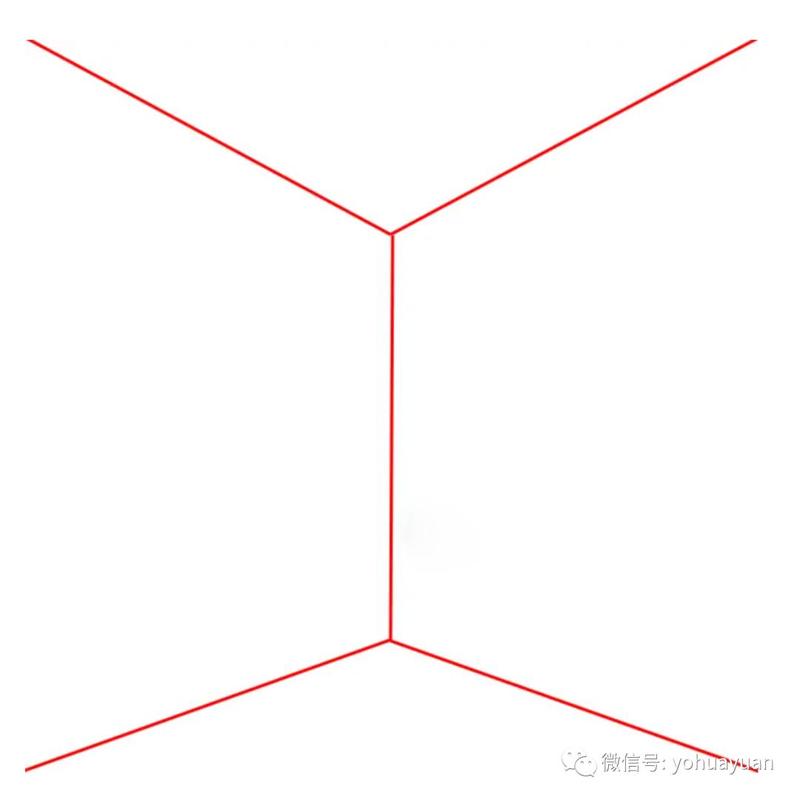 中心的蓝色圆圈表示消失点,红线表示地平线,蓝线表示从消失点辐射出的平行线。