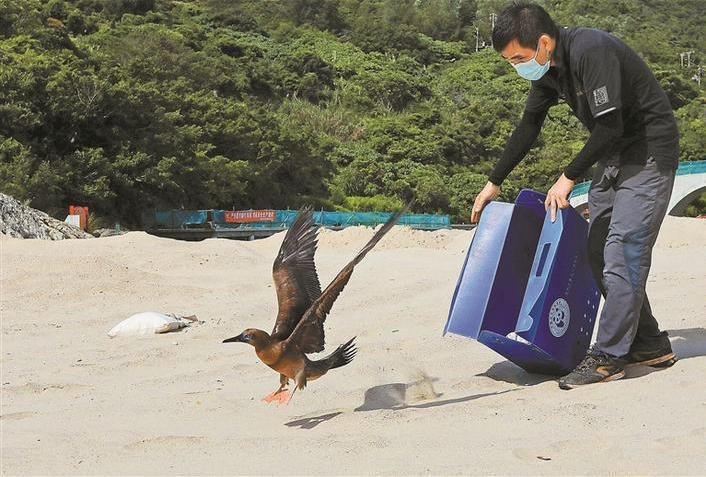 红脚鲣鸟“萌萌”被成功放归大自然。深圳晚报记者 李晶川 摄