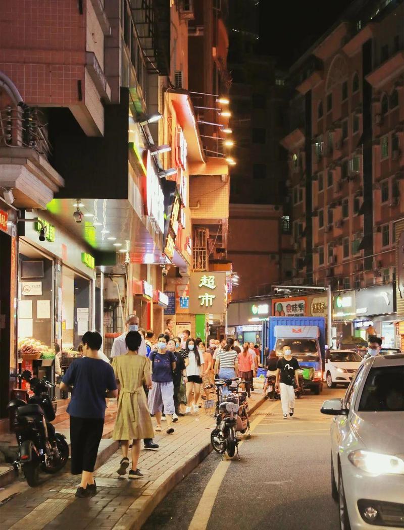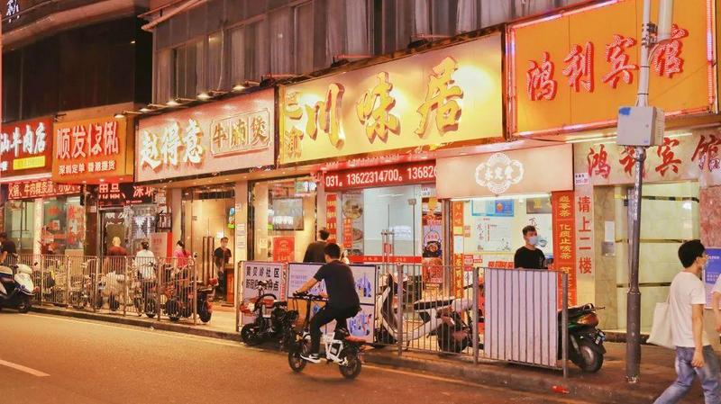 街道两侧,餐饮店里忙得热火朝天,外卖员跑进跑出,咸香辣甜香味交织,川湘粤闽菜系碰撞,味蕾满足了,一天的疲惫也被抚慰。