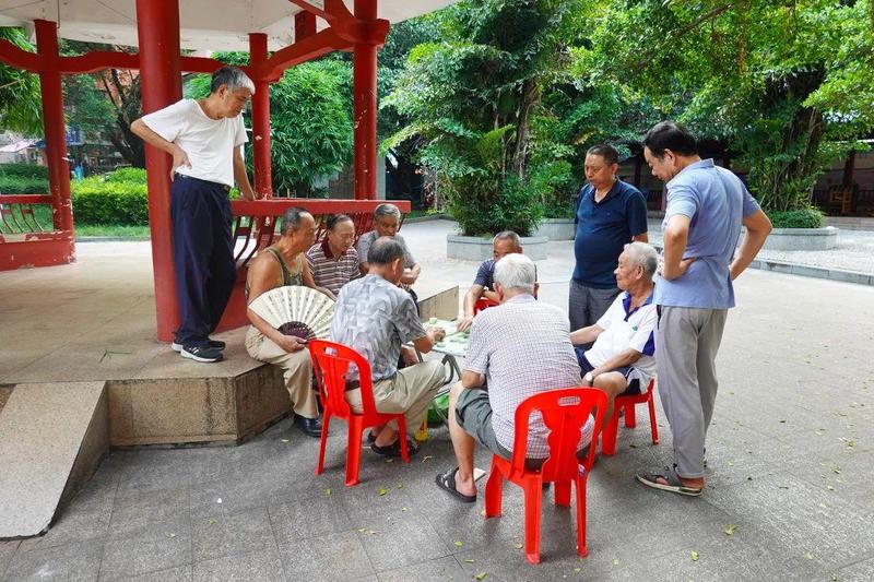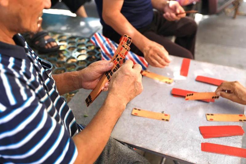 问了旁边的村民才知道,老人们打的是有近2000年历史的四川长牌。几个老人祖籍四川,来深已有30余年,一直住在黄贝岭。夏天屋里闷热,他们闲来无事就约上老乡,摆上方桌小凳,操着数十年不改的乡音,玩上几局长牌。