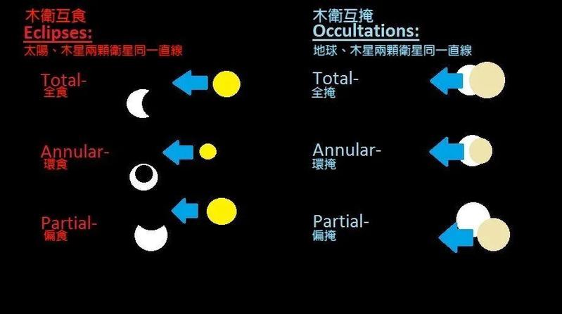 木卫一(Io)、木卫二(Europa)、木卫三(Ganymede)和木卫四(Callisto)每六年会出现互相掩食现象,持续约十六个月。