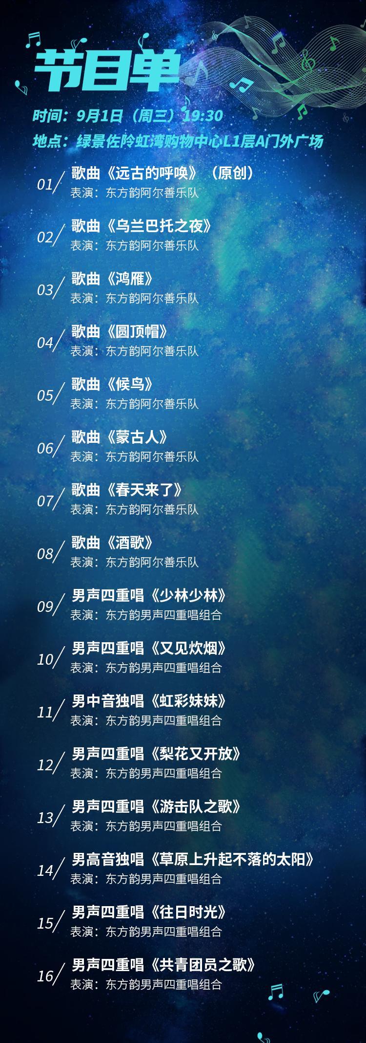 《远古的呼唤》《鸿雁》《又见炊烟》《往日时光》......等大家耳熟能详的经典金曲将在商圈夜色的映衬下,由东方韵阿尔善乐队、东方韵男声四重唱组合缓缓唱响。在现代化的楼宇里,一边感受着这座城市的五光十色,一边又能“穿越”回那些年,重温拨动心弦的时代之音,岂不美哉!