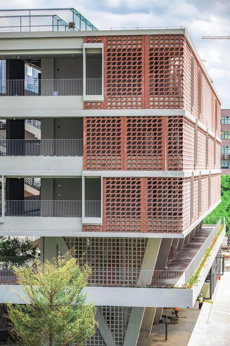 学校的建筑设计理念,灵感来源于中国式传统书院。办公楼和4栋教室楼一字排开,形成4个水平展开的院落,俯瞰有点围屋的即视感。