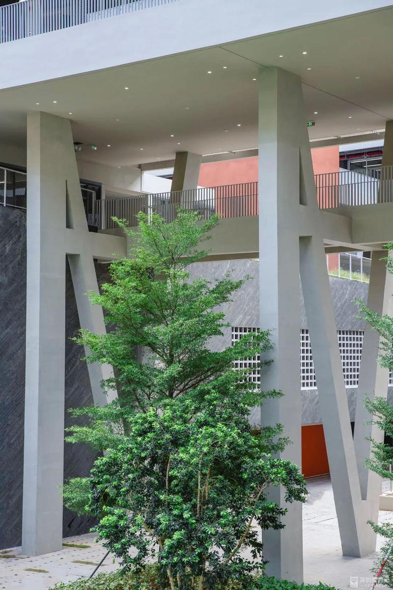 我们之所以会觉得架空层、体育馆特别开阔,很大程度得益于高大的异型斜柱设计。好看是好看,但施工难度巨大。