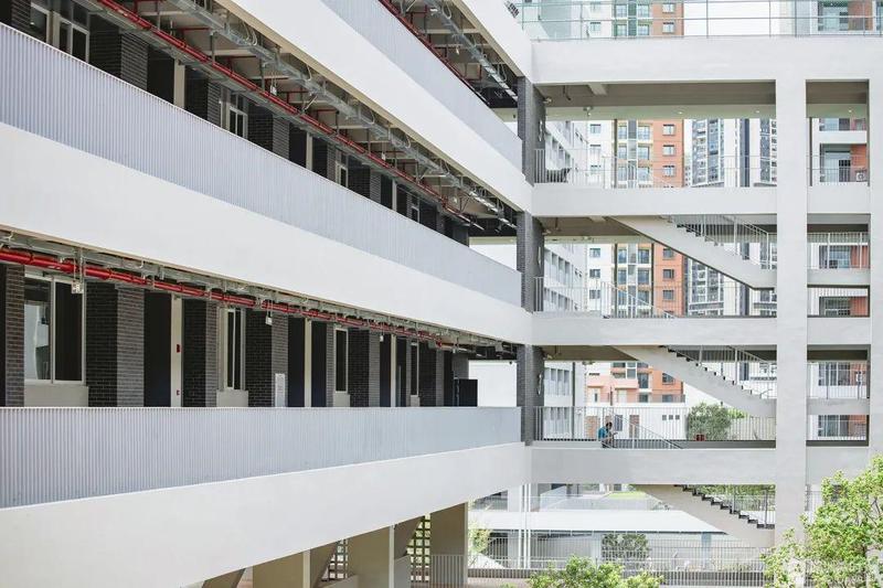 二层连廊将教学楼、体育馆和生活区串联起来,无论是上学来上课,还是放学回宿舍,亦或去打球运动,可说是一路通达,而且完全不用担心日晒雨淋。