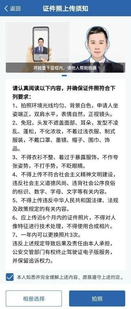 ③ 系统支持从手机相册选择证件照上传,上传前请仔细阅读证件照要求,相册照片经审核通过后,系统生成电子驾驶证。