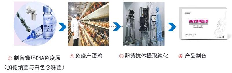 接下来将疫苗注射给产蛋鸡,免疫后的母鸡就产生了抗加德纳菌和白色念珠菌的抗体。这个抗体存在于鸡蛋黄里,我们再把鸡蛋黄里的抗体成分提取出来就制备成了曦曦爱乳酸液体抑菌凝胶。