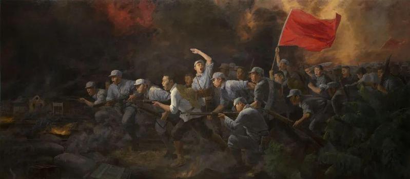走进展览现场,油画《东江纵队平湖站激战伪军大捷》悬挂在中国共产党历史展览馆四楼,长4.6米、高2米。画面突出火红的旗帜,隐喻血染的风采,是无数革命先烈紧跟党、抛头颅洒热血的象征。红旗随风飘动,暗示这是一场激烈的战争,也彰显东江纵队在党的领导下,不畏强敌、英勇拼搏的精神。硝烟弥漫的场景使画面空间感的纵深增强,气势宏大。烟雾中透出橙红色的光,浓厚了战争氛围,象征着胜利曙光的到来。画面中军民构成的正面力量形成一种楔形构图,动作勇猛,势如一把锋利的尖刀直插敌军心脏;他们动势前倾,高低错落,直面前方不远处的爆炸场景,强光照在部分战士的身体上,形成更丰富的层次感,更加突出英勇形象,具有强烈动感,是砥砺前行的真实写照。