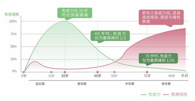 这也是癌症、传染病及慢性疾病大多伴随着老化而来的原因。因为一旦人体的免疫力在20岁到达最巅峰后,免疫系统便随着年龄老化而逐渐走下坡,当40岁时,免疫力只有巅峰时的1/2;等到了70岁,更是只剩下巅峰期的1/10。在无法顺利取得健康免疫细胞的情况下,治疗效果势必大打折扣。