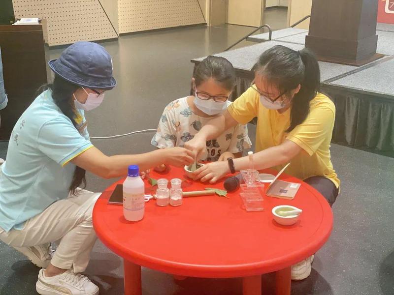 孩子们最喜爱的环节当属童博士带来的“叶绿素的提取与分离实验”以及自然创作“叶拓”。叶绿素的提取与分离包括叶绿素的提取、研磨、分层等步骤,而叶拓是往叶背上涂抹颜料,发挥奇思妙想制作漂亮的书签。在这一环节,孩子们的好奇心和求知热情被激发出来了,他们亲自动手参与,体验操作过程,俨然一个个小“科学家”。