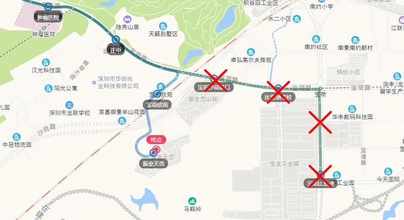 调整后的M306线,覆盖了振业天峦片区,不再途经宝龙比亚迪片区。