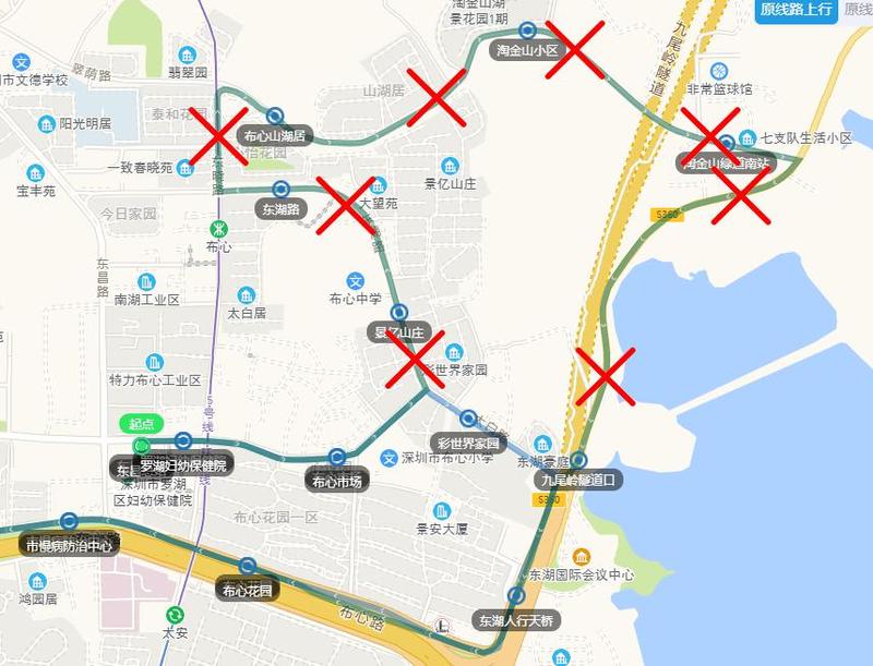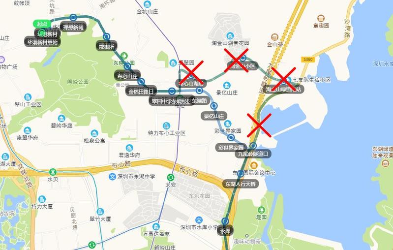 淘金山小区、淘金山绿道南站、九尾岭隧道口、彩世界家园、景亿山庄、东湖路、翠园中学东晓校区、金稻田路口、布心山湖居、淘金山小区