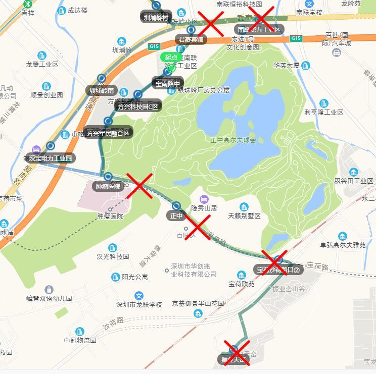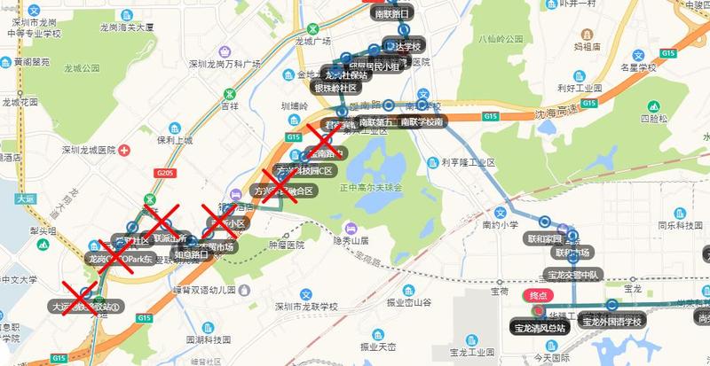 双方向部分途经道路由爱南路、宝南路、宝荷路、爱南路、如意路、龙岗大道、龙飞大道调整为爱南路、碧新路、南同大道、宝龙一路、清风路。