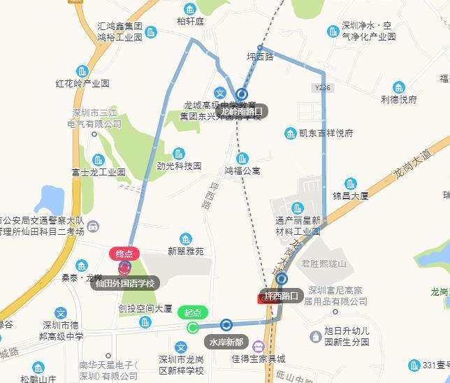 水岸新都、坪西路口、龙岭南路口、仙田外国语学校