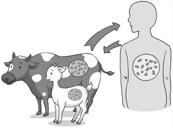 动物染病后,布病首先在同种动物间传播,造成带菌或发病,随后波及人类。病畜的分泌物、排泄物、流产物及乳类含有大量病菌。各型布鲁氏菌在各种动物间有转移现象,可能转移到牛、猪身上,或沿着相反路径传染。羊、牛、猪是重要的经济动物,家畜与畜产品与人类接触密切,从而增加了人类感染的机会。