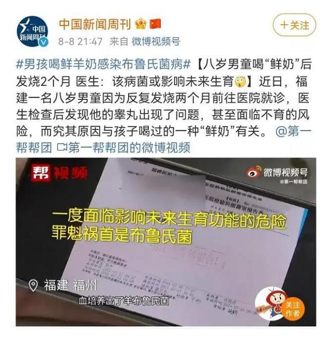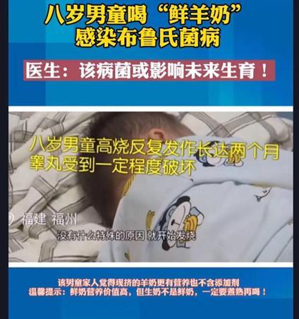 福建福州一名8岁男孩反复发烧2个多月,有时高烧达38℃,家人把他送医院治疗后,医生告知孩子感染了布鲁氏菌病,并表示该病或影响未来生育。家人知道后后悔不已。