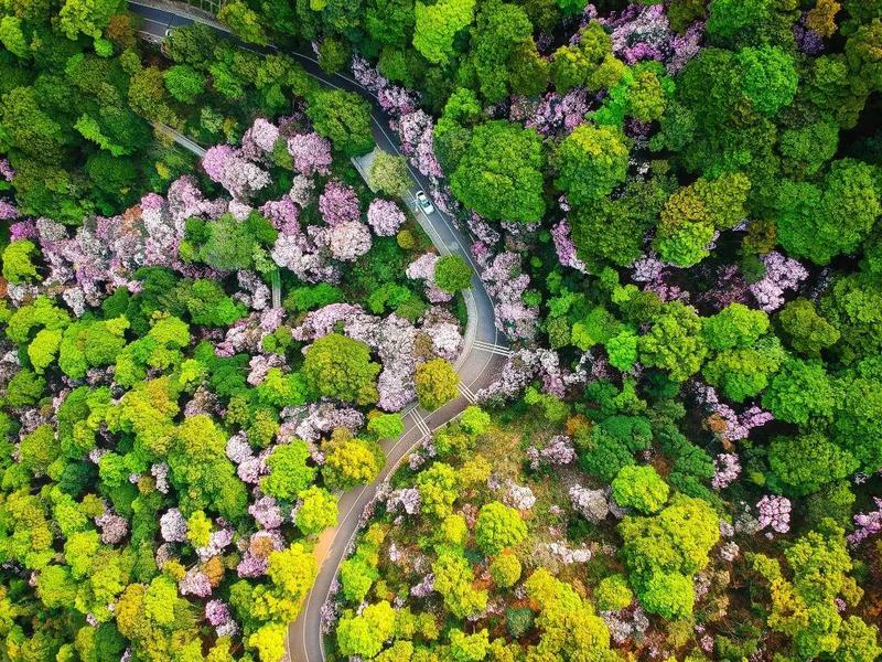 如粉色花瀑悬挂山间