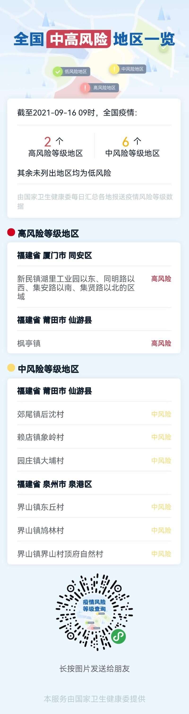 从泉州市防控新型冠状病毒感染的肺炎疫情应急指挥部办公室了解到:14日起,泉港区界山镇鸠林村列为中风险地区;15日起,泉港区界山镇界山村顶府自然村列为中风险地区。