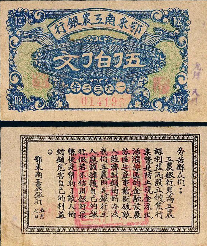 次月,鄂东工农银行正式挂牌营业,进一步加强了对鄂东南苏区金融机构的统一领导。随着6月鄂南苏区得到恢复,鄂东南第一次工农兵代表大会胜利召开,湘鄂赣省鄂东南苏维埃政府成立,鄂东工农银行随之改组更名为鄂东南工农银行,行址设在阳新县龙港,阮筱涛、蔡正华、罗文东等人分别担任过负责人。1932年,鄂东工农银行和鄂东南工农银行分别发行了壹串文、贰串文、拾串文和贰佰文、伍佰文、伍串文等铜币券。