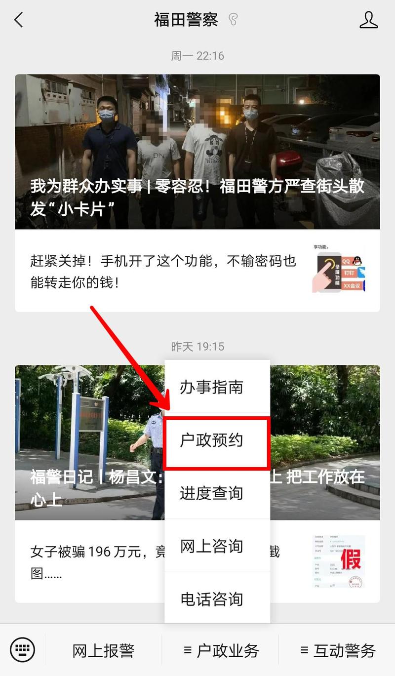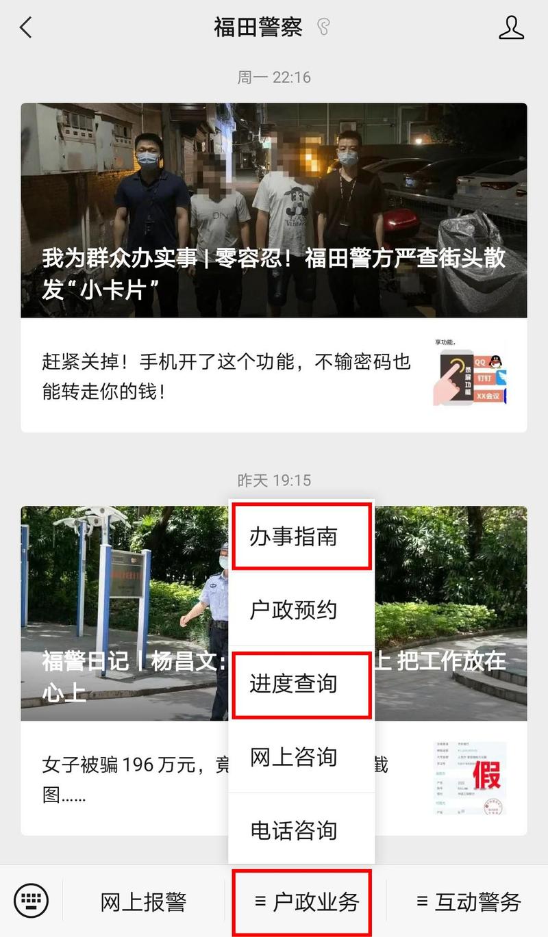 查询业务办理进度、办事指南,可以通过关注“福田警察”微信公众号,点击菜单栏“户政业务”内对应子菜单进行咨询、了解。