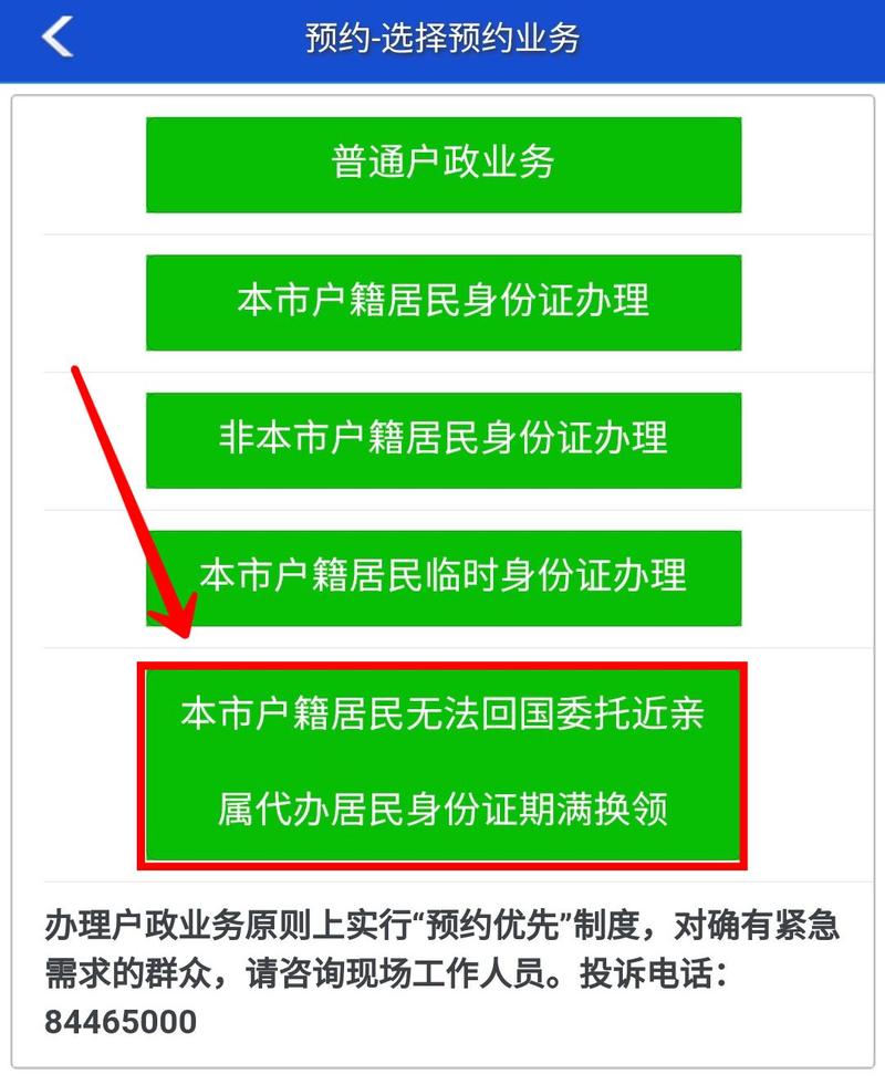 第四步:点击“本市户籍居民无法回国委托近亲属代办居民身份证期满换领”进入