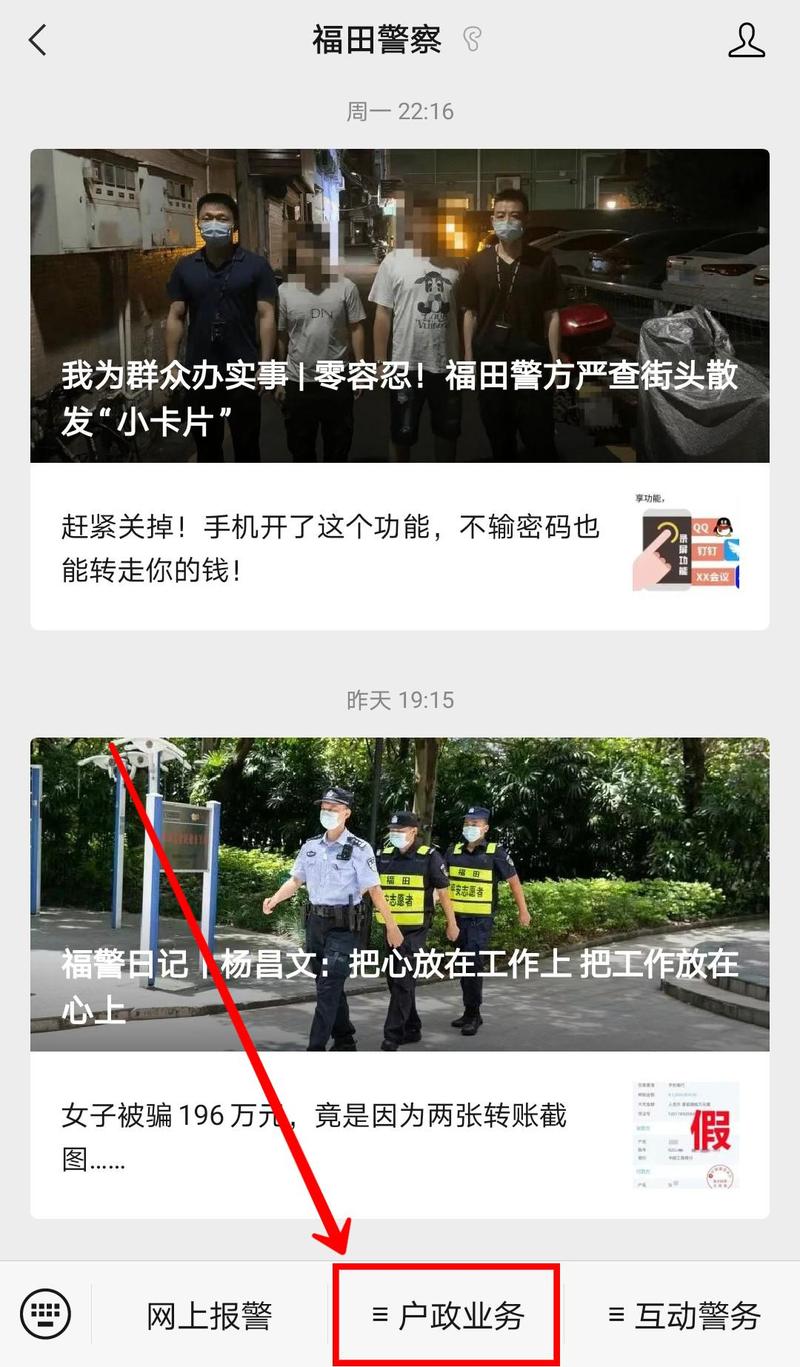 在“福田警察”微信公众号菜单栏中,选择“户政业务”,点击“网上咨询”。