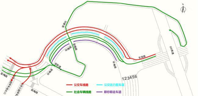 环梅路内圈内侧两条车道为社会车辆通道,环梅路外圈外侧两条车道为公交专用道