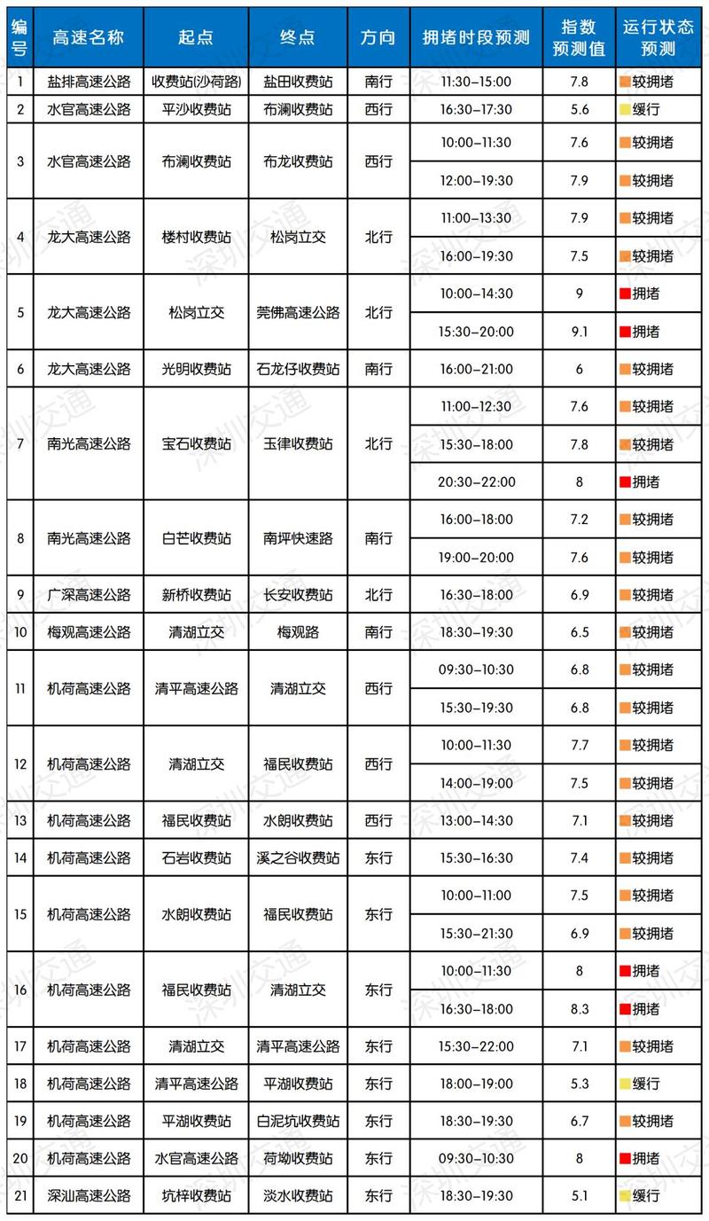 沈海高速、龙大高速、珠三角环线高速、京港澳高速等。9月19日(假期首日)9时至12时出深高速也将迎来一波拥堵小高峰。